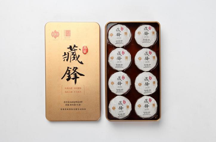 藏锋(迷你) 原料:易武生态茶 类别:生茶 规格:64g(8g*8)/盒 包装:单饼棉纸,铁盒 全国统一零售价:78元/盒
